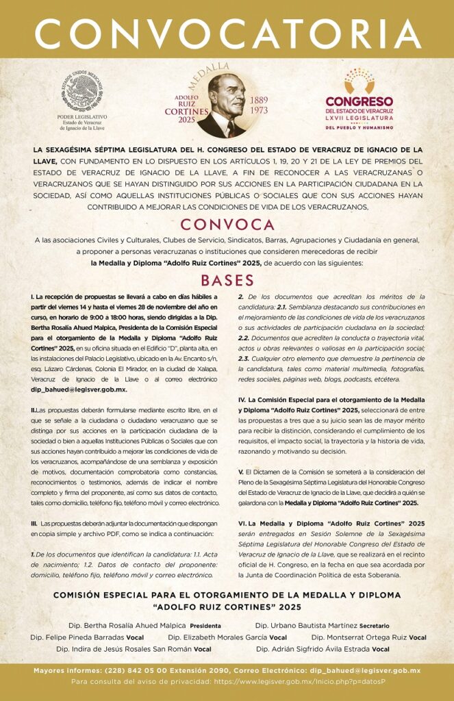 Xalapa, Ver., 14 de noviembre de 2025.- La Comisión Especial para el Otorgamiento de la Medalla y Diploma Adolfo Ruiz Cortines 2025, presidida por la diputada Bertha Rosalía Ahued Malpica, emitió la convocatoria, a fin de reconocer a las veracruzanas y los veracruzanos que se hayan distinguido por su participación en la sociedad, así como aquellas instituciones públicas o sociales que con sus acciones hayan contribuido a mejorar las condiciones de vida de la población.