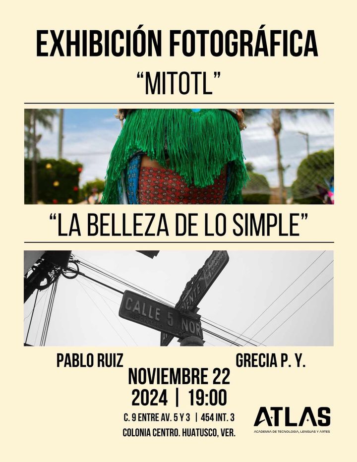La academia ATLAS se enorgullece en presentar la exposición fotográfica «Mitotl» y «La Belleza de lo Simple», una muestra de los resultados del trabajo en la materia de fotografía. La exposición estará a cargo de Pablo Ruiz, maestro de fotografía en ATLAS, y de Grecia P. Y., alumna de la primera generación de la academia. La inauguración se llevará a cabo el próximo 22 de noviembre de 2024 a las 19:00 horas en C. 9 entre Av. 5 y 3, Colonia Centro, Huatusco, Veracruz.