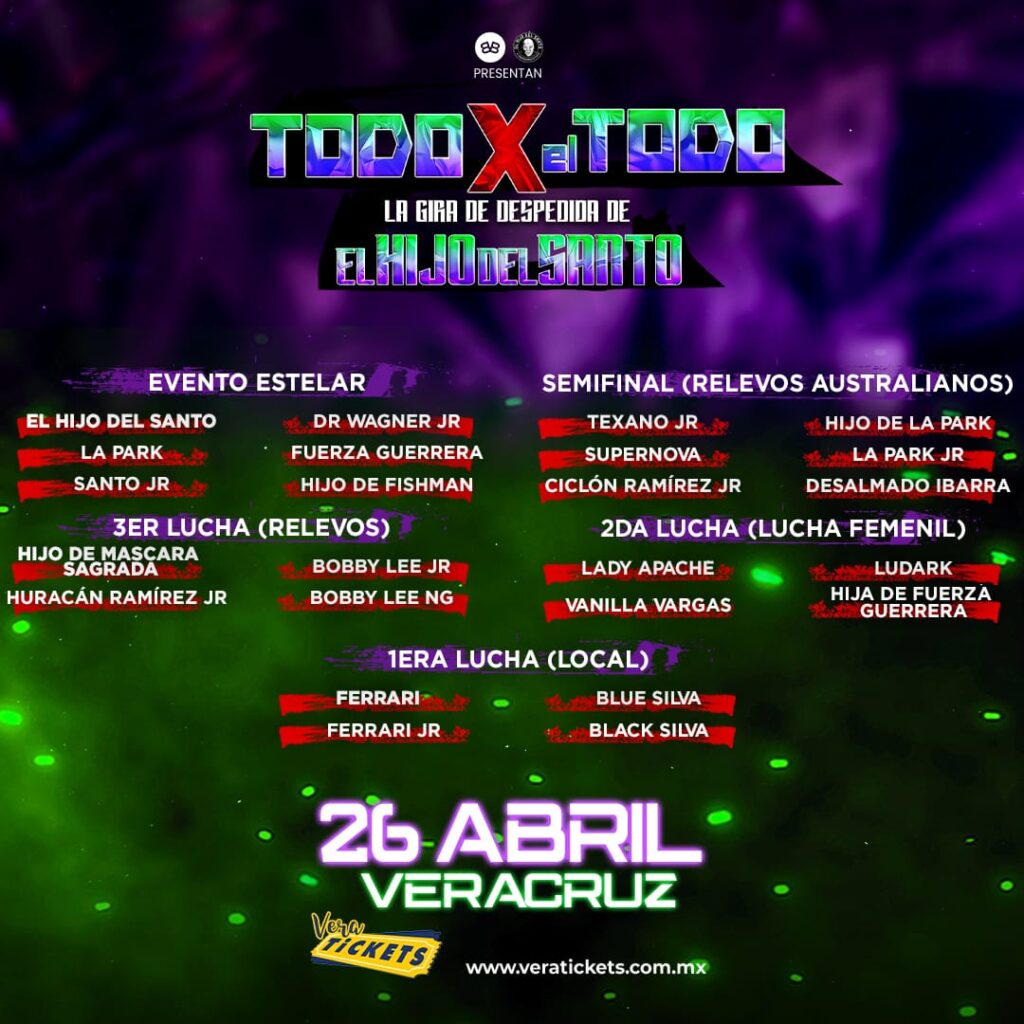 Recordemos que esta función “Todo x el Todo” de despedido de El Hijo del Santo será el sábado 26 de abril a partir de las 17:00 horas en el auditorio Benito Juárez, un recinto cómodo y con aire acondicionado, por lo que habrá mayor comodidad.