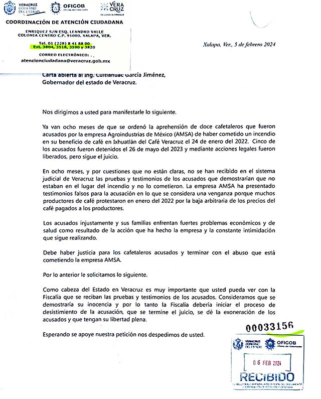 Van más de ocho meses que se dio orden de aprehensión contra 12 cafetaleros en Veracruz acusados con testimonios falsos de haber cometido un incendio en una oficina del beneficio de café de AMSA en Ixhuatlán del Café, Veracruz el 24 de enero del 2022.